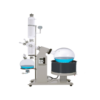 蒸發瓶恒速旋轉,水浴鍋恒溫(wēn)加熱(rè),在此條件下:物料(liào)在蒸發瓶內壁形成大麵積均勻薄膜(mó)快速蒸發(fā),在真空條件下可以提高(gāo)蒸發效率(需連接真空裝置),溶媒蒸汽(qì)經玻璃冷(lěng)凝盤管時冷卻成液體(需(xū)連接冷卻裝置),回收於收集瓶。