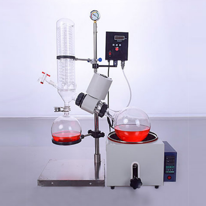 蒸發瓶恒速旋轉,水浴鍋恒溫加(jiā)熱,在此條件下:物料在蒸發瓶內壁形成大麵積均勻薄膜快(kuài)速蒸發,在真空條件下可(kě)以提高蒸發效(xiào)率(需連接真空裝置),溶媒蒸汽經玻璃冷凝盤管(guǎn)時冷卻成液體(需連接冷卻(què)裝置),回收於收(shōu)集瓶。