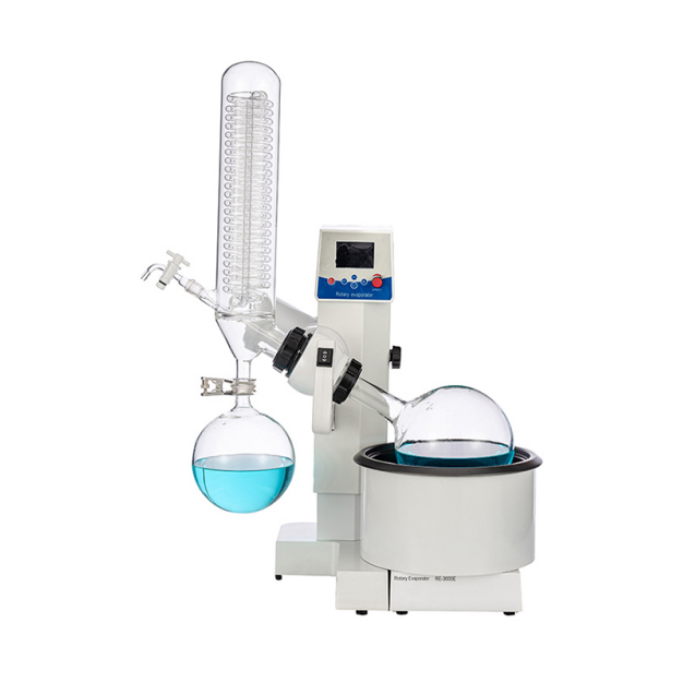 蒸發瓶恒(héng)速旋(xuán)轉,水浴鍋恒溫加熱,在(zài)此條件下:物料在蒸發(fā)瓶內壁形成大麵積均勻薄膜快速蒸發,在真空條件下可以提高蒸發效率(需連接(jiē)真空裝置),溶(róng)媒蒸(zhēng)汽經(jīng)玻璃冷凝盤管時冷卻成液體(需連接冷卻裝置(zhì)),回收於收集瓶。