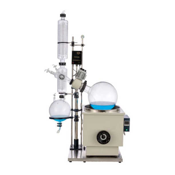 蒸發瓶恒速旋轉,水浴(yù)鍋恒溫加熱,在此條件下:物(wù)料在蒸發瓶內壁(bì)形成大麵積均勻薄膜快速蒸發,在真空條(tiáo)件下(xià)可以提高蒸發效率(需連接真空裝置),溶媒蒸汽經玻璃冷凝盤管時冷卻成液體(需(xū)連接冷卻裝置(zhì)),回收於收集瓶。